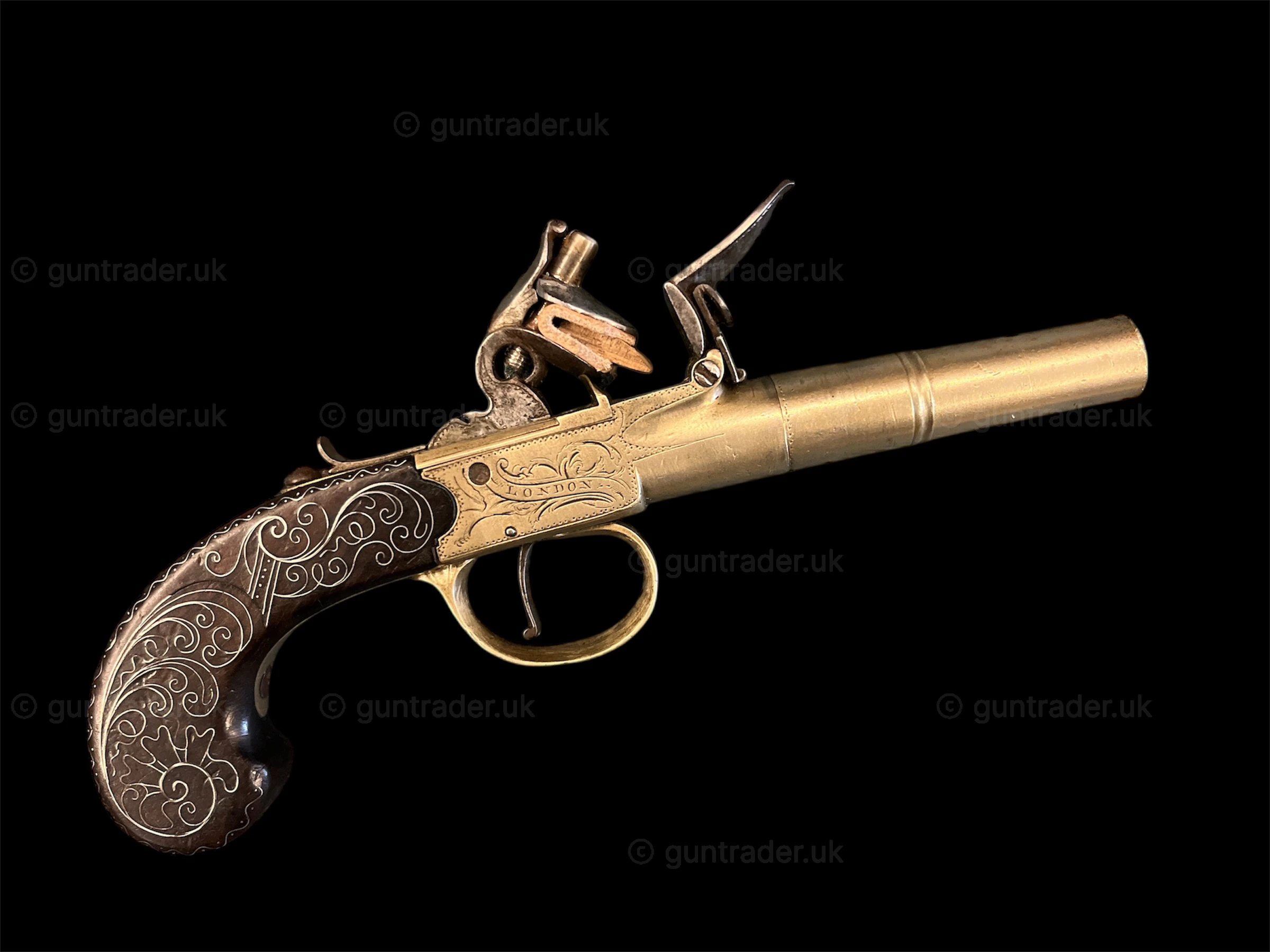 Muff, flintlock pocket pistol by Rawle of London. 7 1/2″ over all length, 2 1/2″ turn off barrel. Pistol grip profusely inlaid with silver scrolling tendrils. Circa 1800. Some damage on one side of pistol grip.