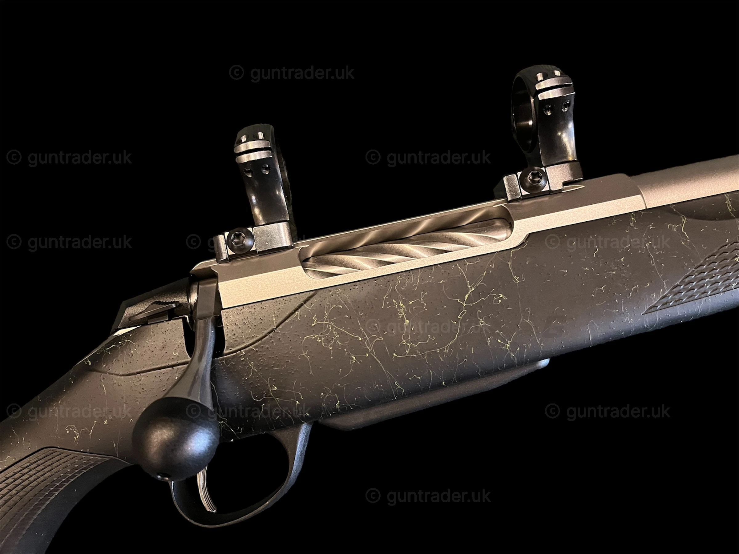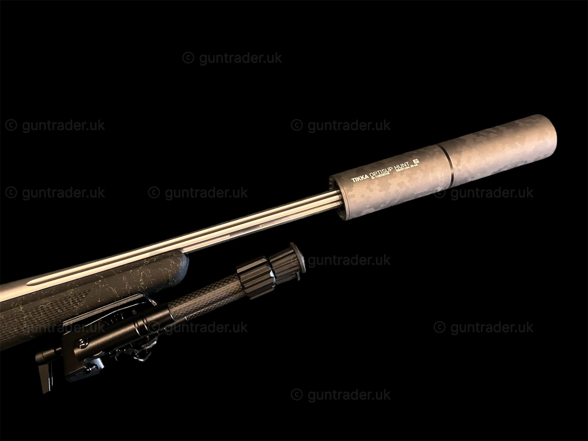 Tikka T3x Roughtech Emerald with fluted stainless barrel Screwcut 5/8×24 With: Optilock Tikka rings and bases Blued Tikka Optisup Sound Moderator GMK Carbon Bipod 7-10 Inch Tikka Camo Rifle slip Niggeloh Tikka Sling Stable sticks