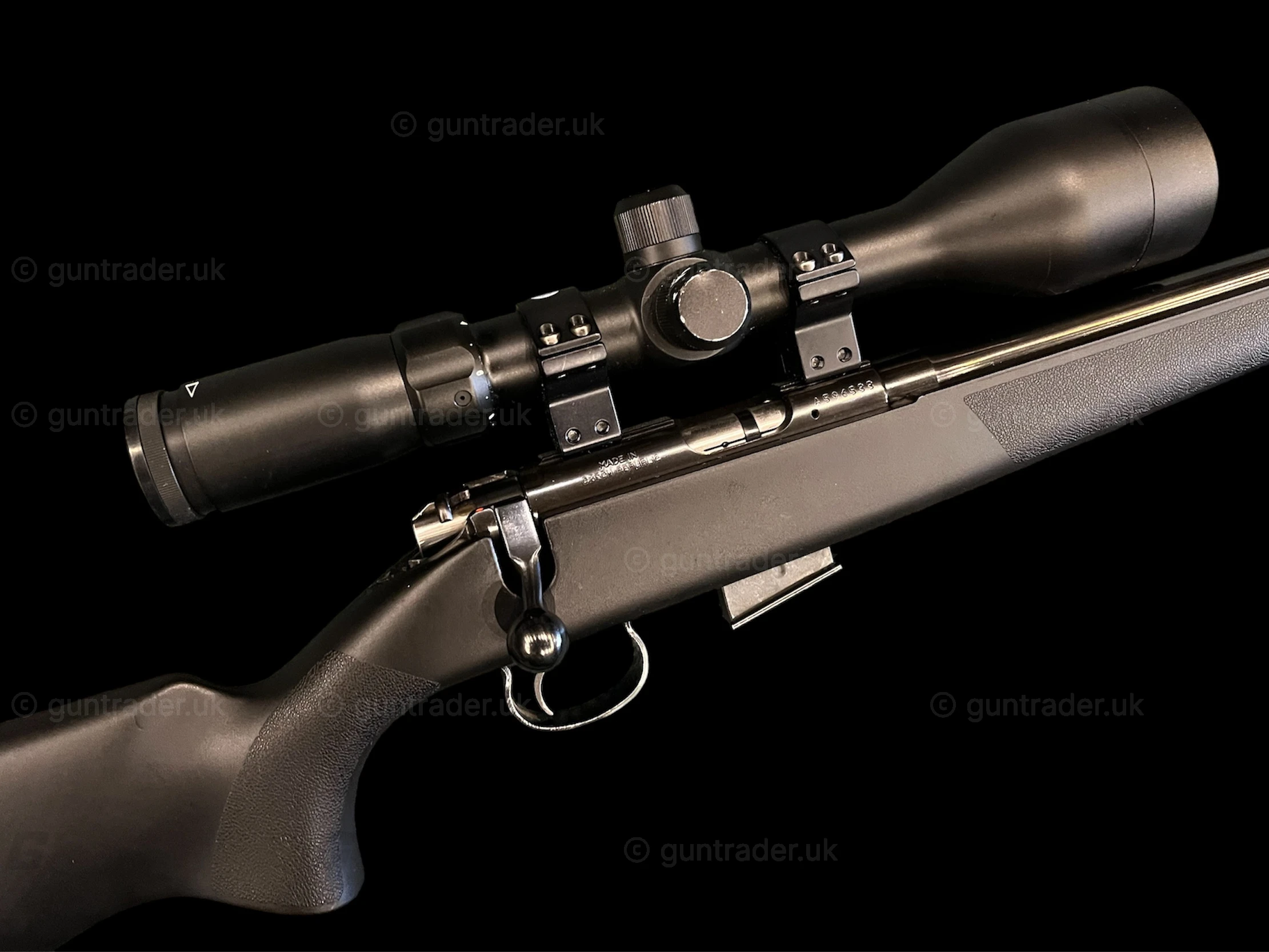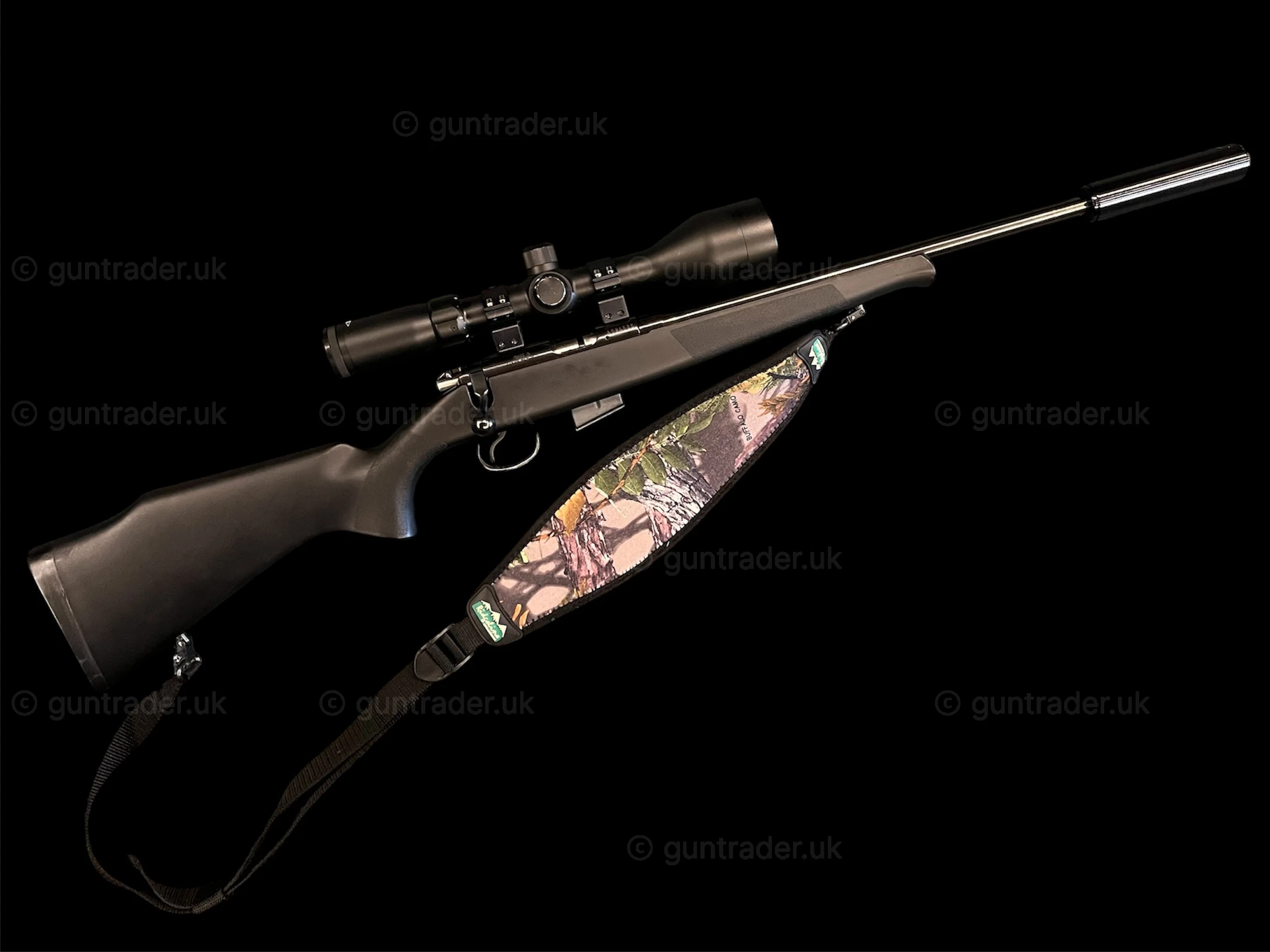 CZ American Synthetic stock, fitted with Sak sound moderator, Bushnell 3-12×56 scope and sling.
