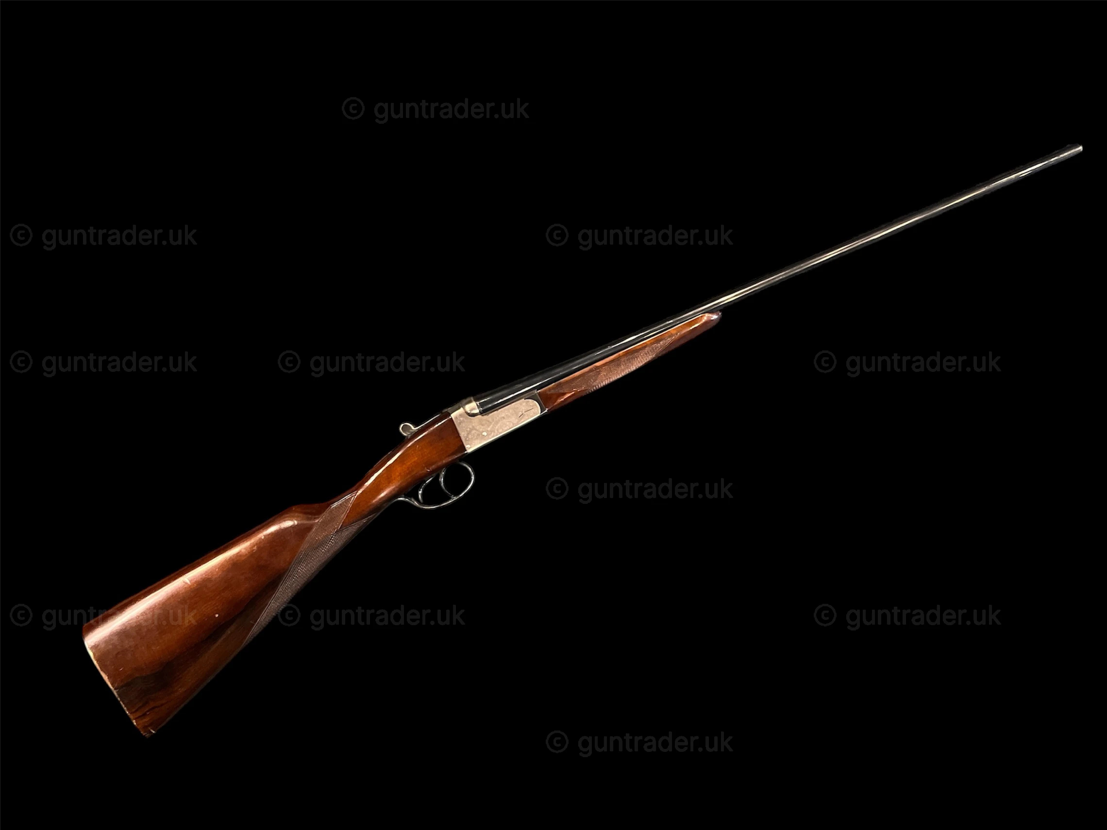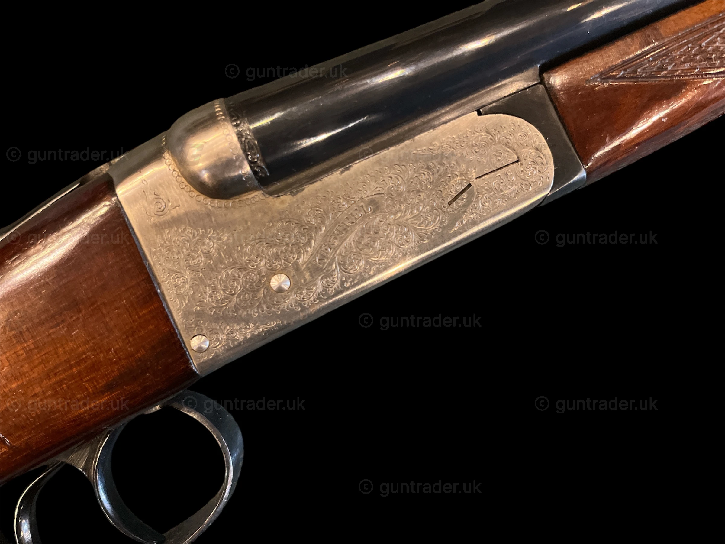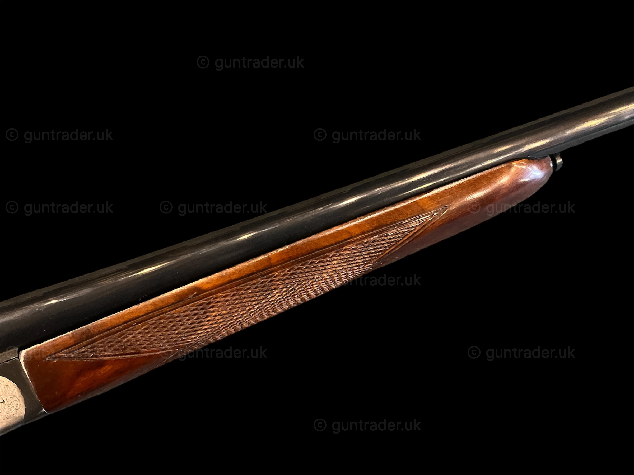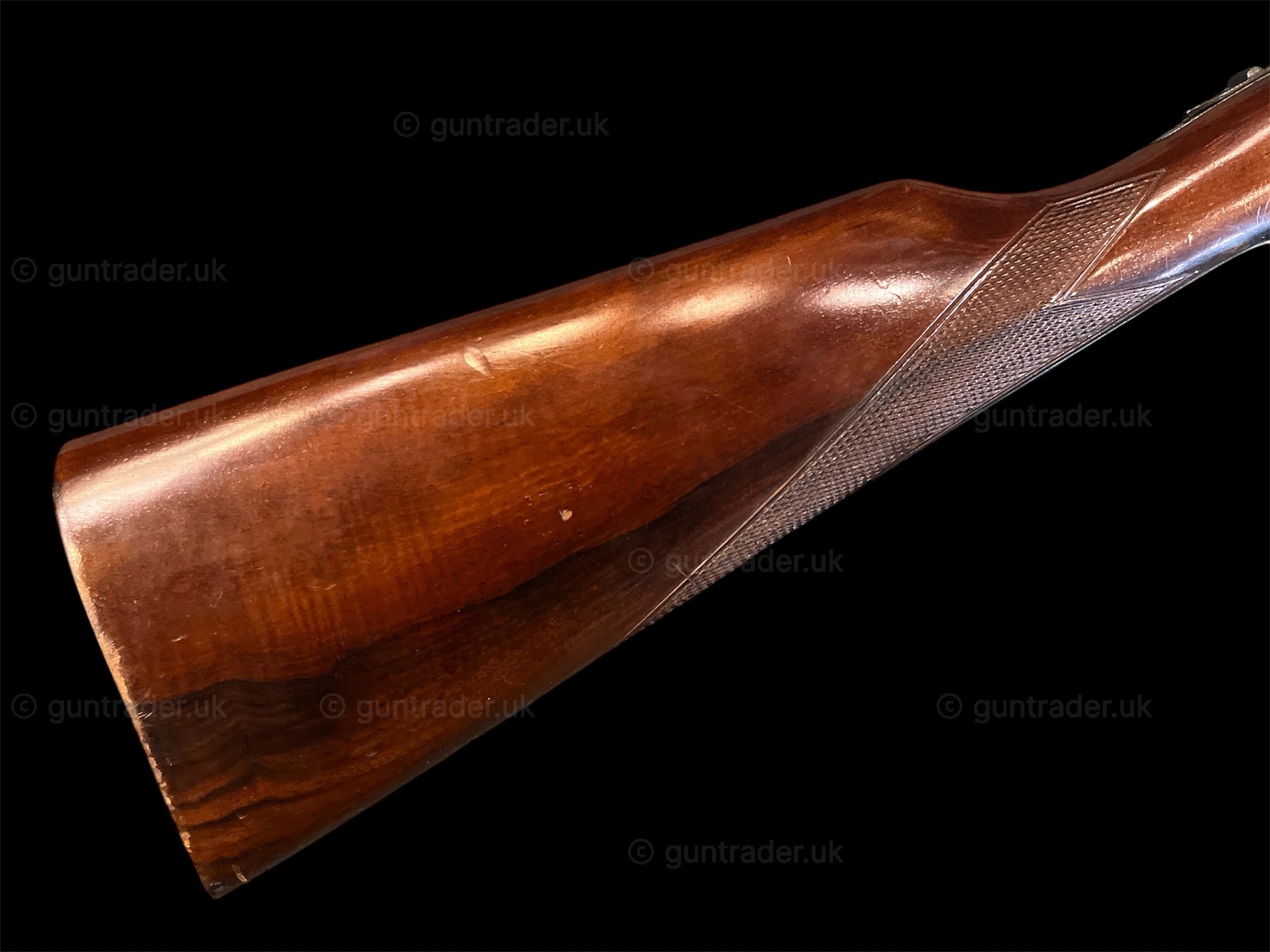 Very clean little shotgun. Crisp chequering. Straight hand stock. Scroll engraved with name banner.